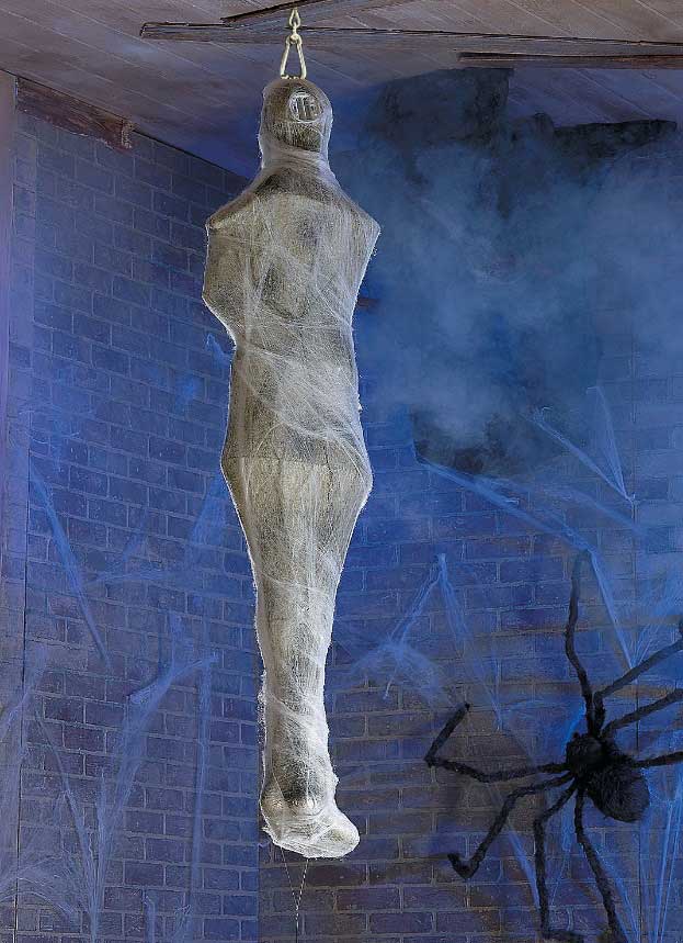 I had never been so filled with anticipation for Halloween night as this one. For tonight I would actually be part of my girlfriend's decoration for the trick-or-treaters, her hanging mummy playing out a fantasy being on display in skintight clothing and bondage. And how lucky I was to have a girlfriend who was so willing to help me experience this out at least this once. It would not be the first time she would put me in this form of constraint. We had played it out and experimented numerous times. But as she began decorating her porch for the night of trick-or-treaters with black light and glowing figures, I asked her what she thought of how the white bandages of a hanging mummy would glow and maybe even frighten a few of the older guests by unexpected movement. So with a little rigging of a hook to support my weight safely and the acquisition of plenty of white roller gauze for bandages added to the rest of our toys, we were ready.